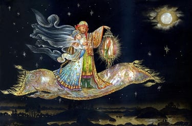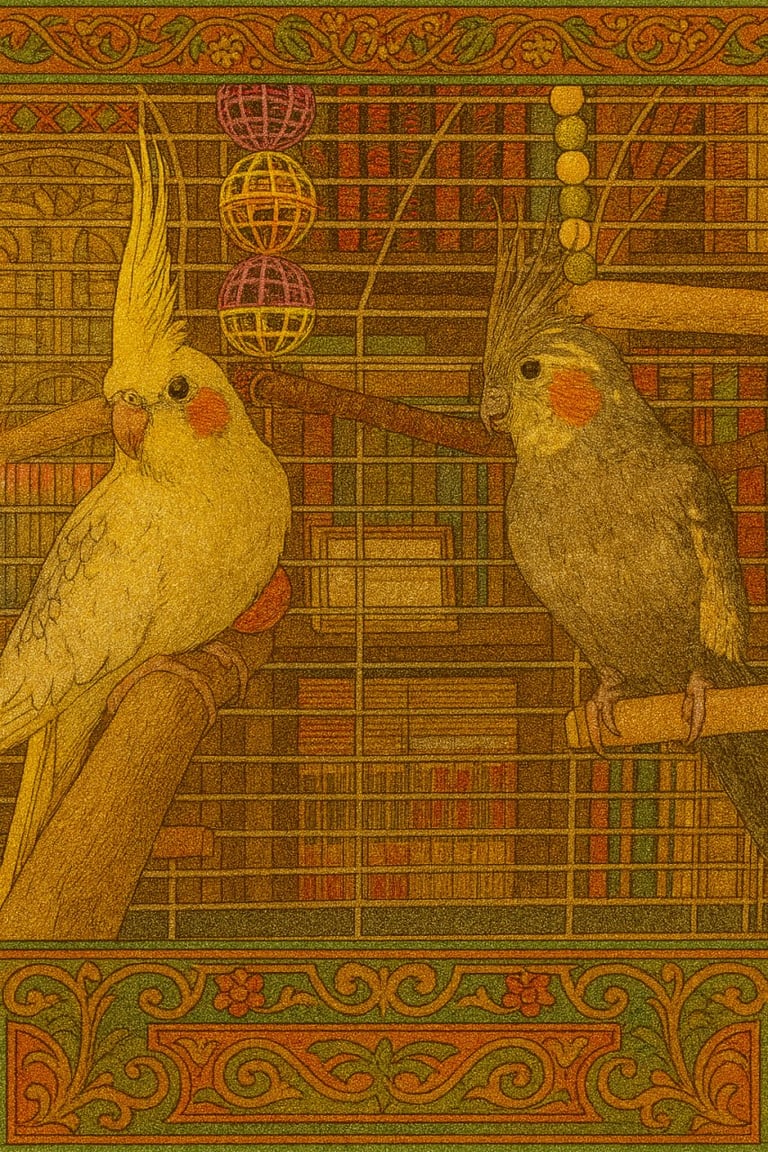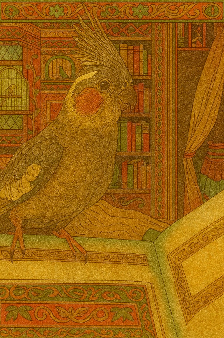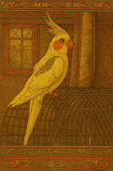 Yet one day those wizards of the heavens set forth on a far journey to see what the merchants from beyond the sea-ocean had brought. From stall to stall they wandered, gazing at strange wares never before seen in those parts. And there they beheld a golden cockatiel, fairer than any other bird from overseas. She was like to the Firebird herself: feathers of bright yellow, cheeks of orange, and a splendid crest like a little crown upon her head. And upon her leg she wore a ring, not of gold, but of emerald.